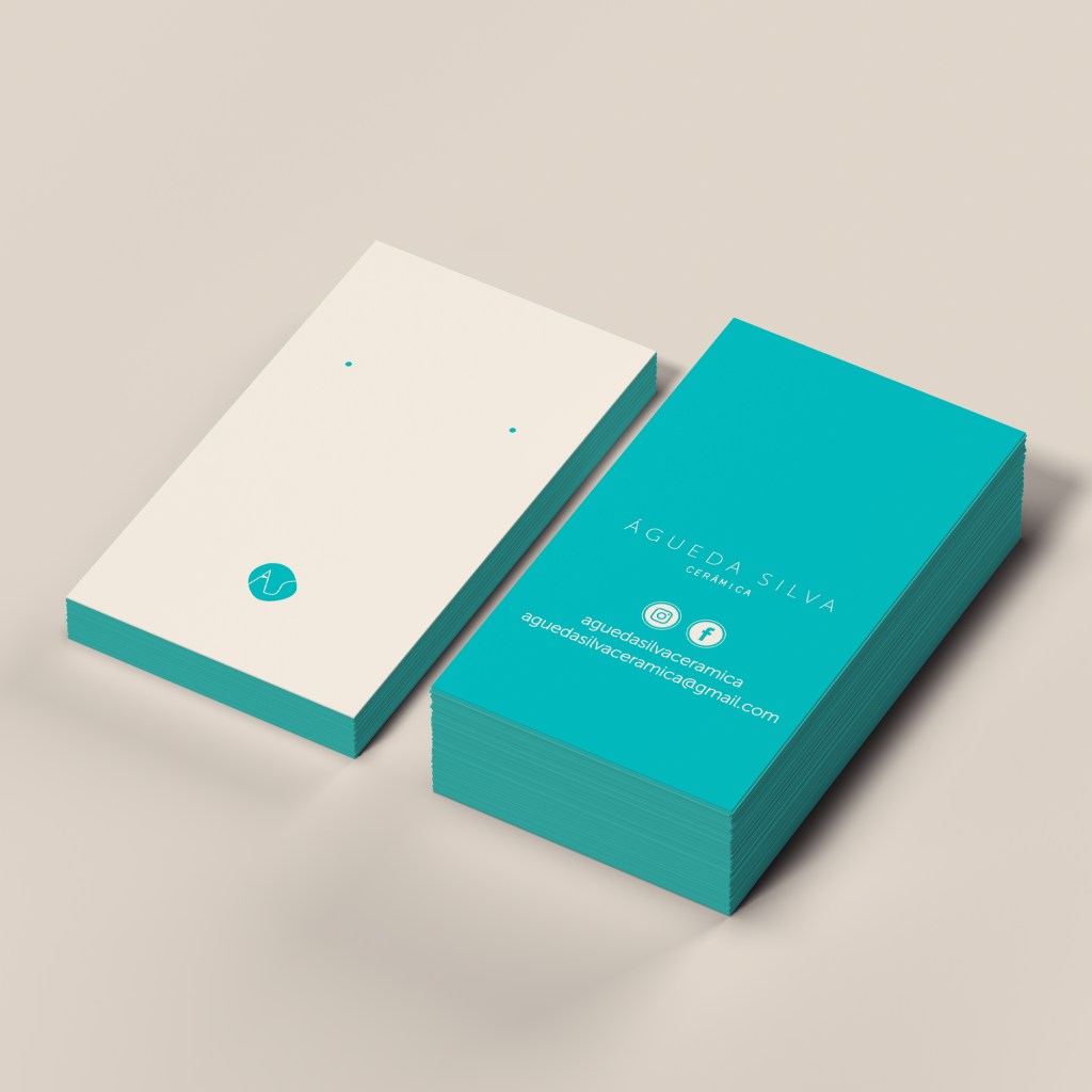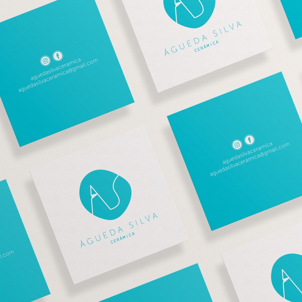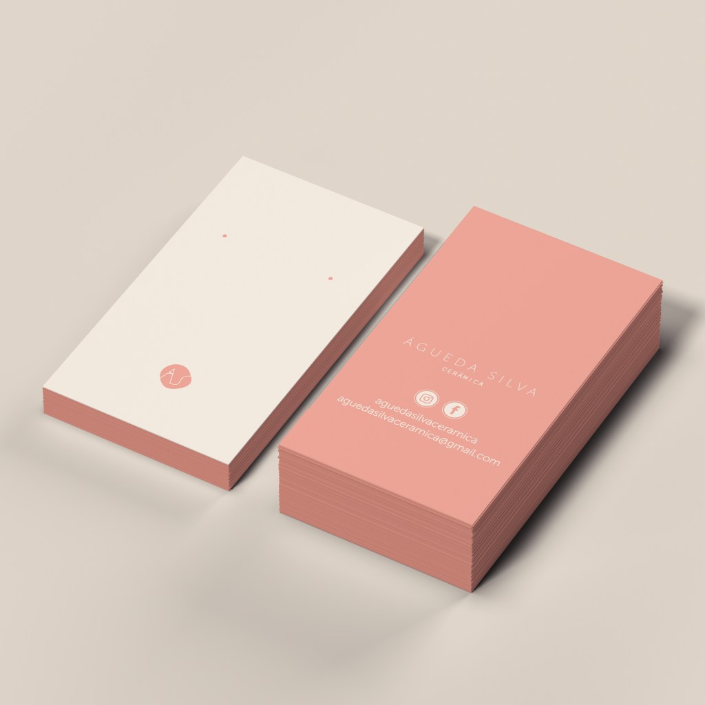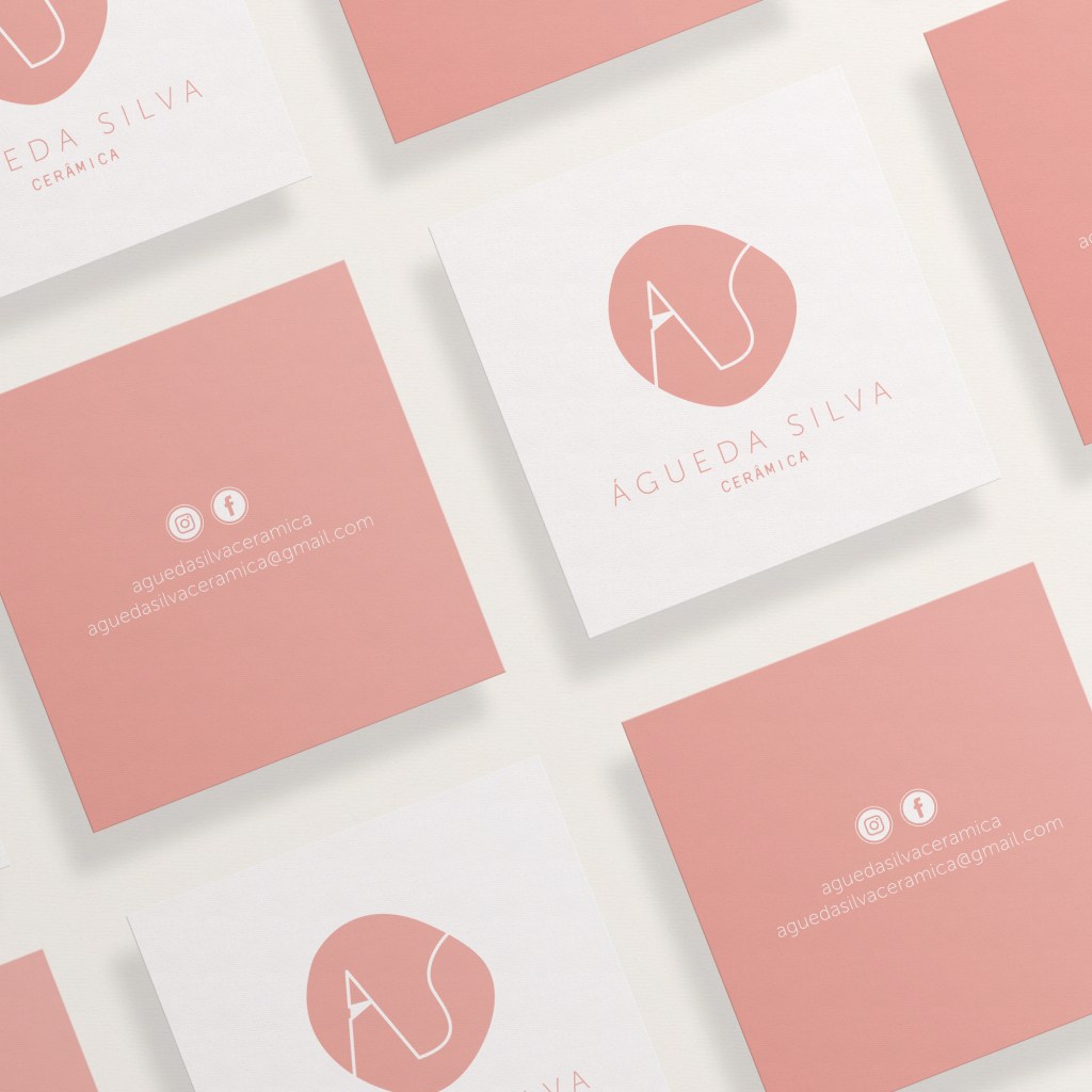 A identidade visual da Agueda Silva Cerâmica acompanha uma joalharia feita à mão, sensível e singular. Os tons de rosa queimado e azul turquesa, presentes na maior parte das coleções da ceramista, definem a paleta cromática aplicada em cartões, tags e demais suportes.