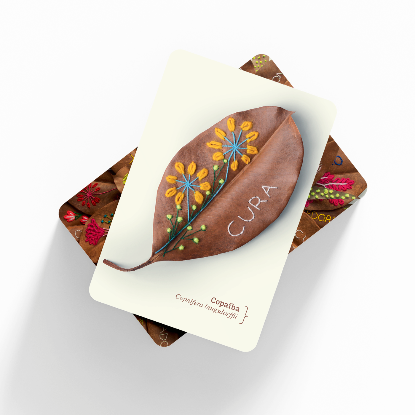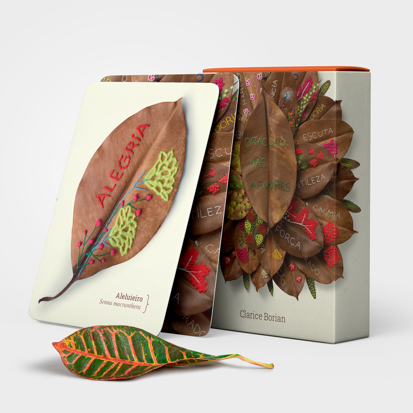 Um livreto que acompanha um conjunto de 36 cartas que trazem a imagem de palavras bordadas em folhas secas. Cada uma das palavras remete a uma espécie de árvore nativa brasileira.